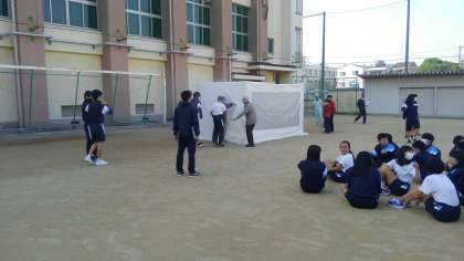 生野消防署の方に来ていただいて、3年生は煙体験を行いました。その様子です。