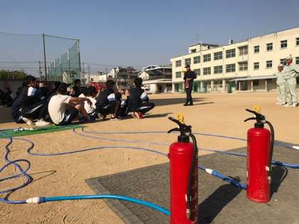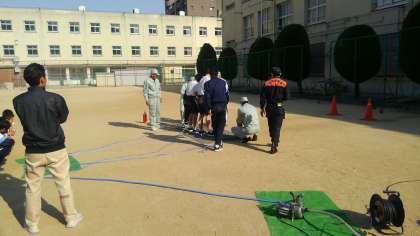 初期消火訓練の様子です。実際に消火器を持って体験をしました。