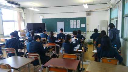2年国語の様子です。クラスを半分に分けて、少人数による書道です。