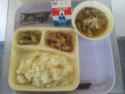 今日の給食は焼き肉、五目汁、きゅうりともやしのおひたし、焼きのり、ごはん、牛乳です。