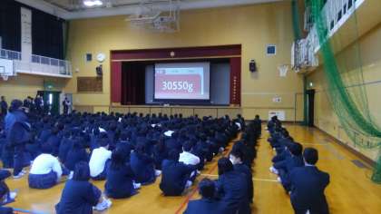 全体で30550g集まり、その中で1番集めたクラスが1年2組で12800gでした。そして、1年2組を表彰しました。
