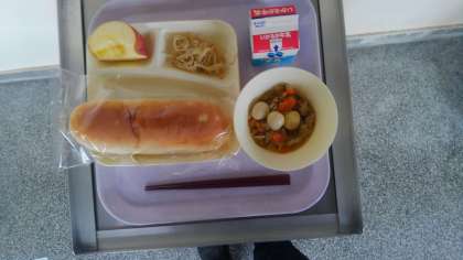 八宝菜、もやしのごま酢和え、りんご、パン、牛乳