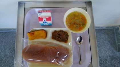 コーンスープ、かぼちゃのプリン、パン、牛乳