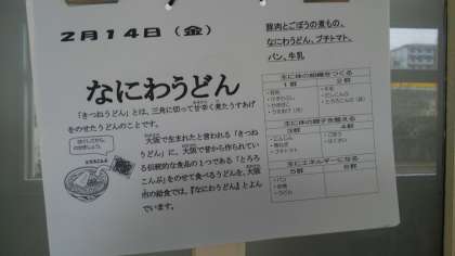 大阪で生まれたと言われる「きつねうどん」に、大阪で昔からつくられている伝統的な食品の1つである「とろろこんぶ」をのせて食べるうどんを、大阪市の給食では『なにわうどん』とよんでいます。