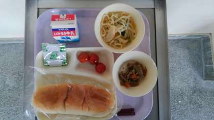 豚肉とごぼうの煮物、なにわうどん、プチトマト、パン、牛乳