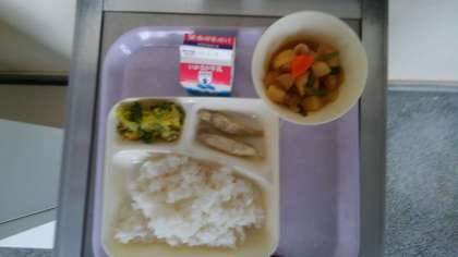 きびなごてんぷら、一口がんもとじゃがいもの煮物、ブロッコリーのごまあえ、ご飯、牛乳