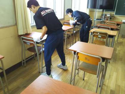 正門で消毒をした後、教室に入り、課題の提出・確認などを行いました。使用した机等の消毒を行っています。