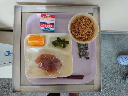 1/2パン、焼きそば、オクラの甘酢あえ、オレンジ、牛乳