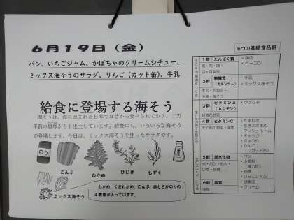海そうは、海に囲まれた日本では昔から食べられており、1万年前の貝塚からも出土しています。給食にも、いろいろな海そうが登場します。今日は、ミックス海そうサラダです。わかめ、くきわかめ、こんぶ、赤とさかのりの4種類が入っています。