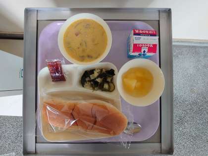 パン、いちごジャム、かぼちゃのクリームシチュー、ミックス海そうのサラダ、りんご(カット缶)、牛乳