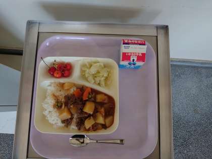ハヤシライス、キャベツのゆずドレッシング、さくらんぼ、牛乳