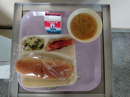 パン、ウィンナーのケチャップソース、スープ、キャベツとさんどまめのサラダ、牛乳