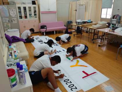 生徒会役員たちで、文化発表会のスローガンを書いた横断幕を作成しています。