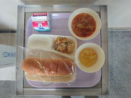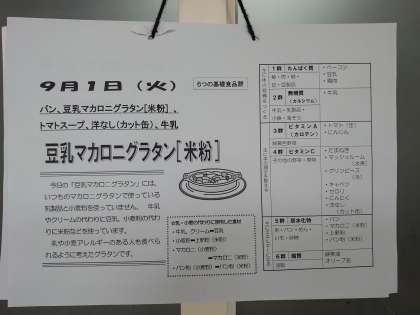 パン、豆乳マカロニグラタン〔米粉〕、トマトスープ、洋ナシ(カット缶)、牛乳