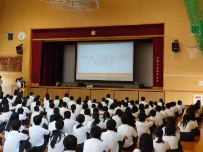 今日は、校長講話の後に、生徒会からプルタブ回収の報告がありました。