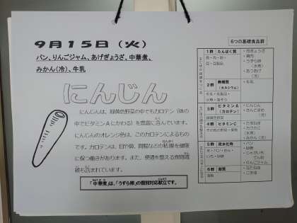 にんじんは、緑黄色野菜の中でもカロテン(体の中でビタミンAにかわる)を豊富に含んでいます。にんじんのオレンジ色は、このカロテンによるものです。カロテンは、目や鼻、胃腸などの粘膜を健康に保つ働きがあります。また、便通を整える食物繊維も含まれます。