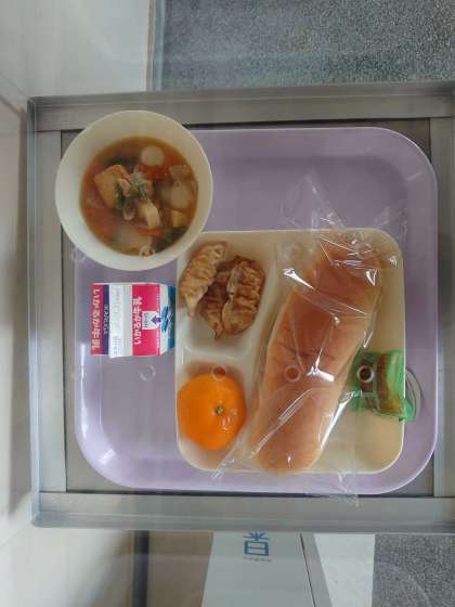 パン、りんごジャム、あげぎょうざ、中華煮、みかん(冷)、牛乳