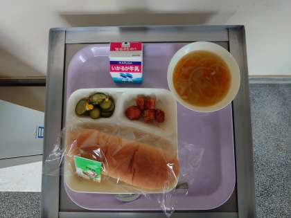 パン、ソフトマーガリン、まぐろのオーロラ煮、ベーコンとじゃがいものスープ、きゅうりとコーンのゆずドレッシング、牛乳