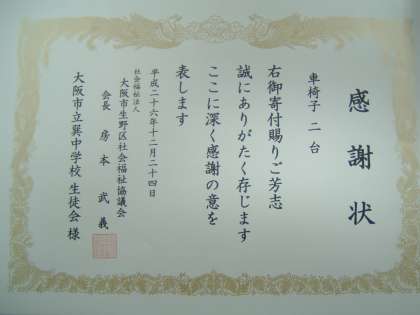 生野区内9中学校の生徒会が中心となってプルタブ回収活動を行い、車いす2台を寄付することができました。昨年12月24日に車いすの寄付収受式が行われ、感謝状を生野区社会福祉協議会よりいただきましたので紹介します。関連の記事が1月26日発行の「ふれあい生野」第47号(2015年2月号)に掲載されますのでこちらもご覧ください。