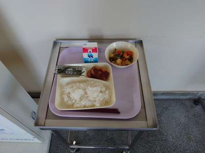 米飯、みそカツ、じゃがいもと野菜の煮もの、焼きのり、牛乳