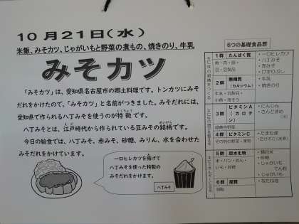 今日の給食では、八丁みそ、赤みそ、砂糖、みりん、水を合わせたみそだれをかけています。