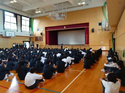 生徒指導主事からは、赤い羽根の共同募金の協力と決まりを守って取り組むことについてのお話がありました。