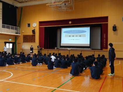 北巽小学校の栄養教諭から、給食の栄養についてのお話をしていただきました。集中して話を聞いています。