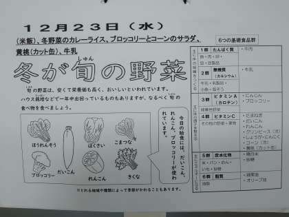 冬野菜のカレーライス、ブロッコリーとコーンのサラダ、黄桃(カット缶)、牛乳