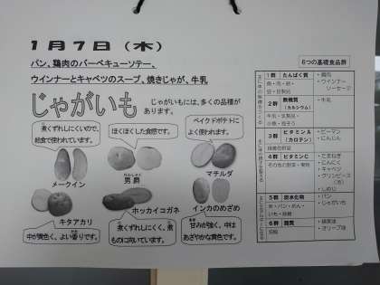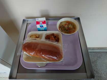 パン、鶏肉のバーベキューソテー、ウィンナーとキャベツのスープ、焼きじゃが、牛乳