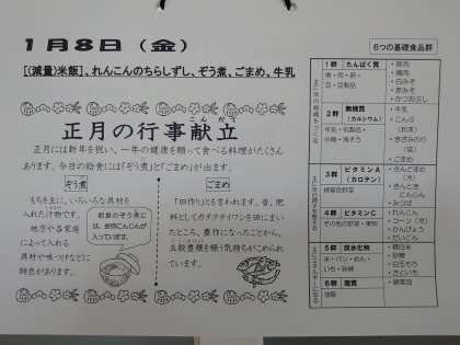 正月には新年を祝い、一年の健康を願って食べる料理がたくさんあります。今日の給食には「ぞう煮」と「ごまめ」が出ました。