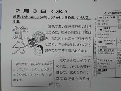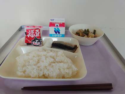 給食では、節分の行事献立として、「いわしのしょうがじょうゆがけ」と「いり大豆」が出ます。