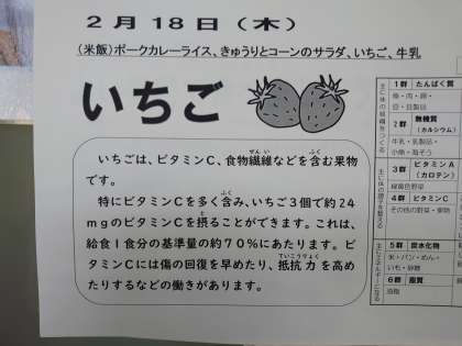 特にビタミンCを多く含み、いちご3個で約24mgのビタミンCを摂ることができます。これは、給食1食分の基準量の約70%にあたります。ビタミンCには傷の回復を早めたり、抵抗力を高めたりするなどの働きがあります。