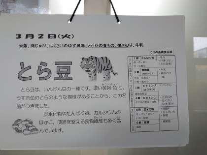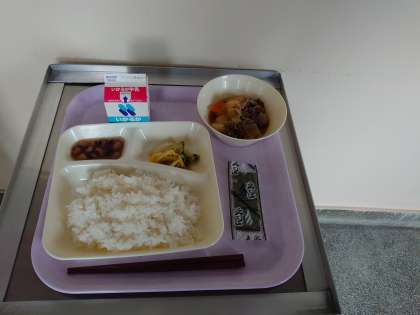 米飯、肉じゃが、はくさいのゆず風味、とら豆の煮もの、焼きのり、牛乳