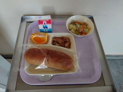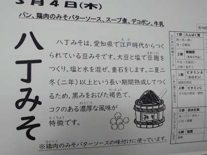 パン、鶏肉のみそバターソース、スープ煮、デコポン、牛乳