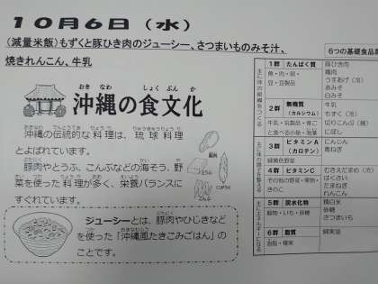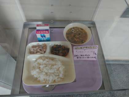 もずくと豚ひき肉のジューシー、さつまいものみそ汁、焼きれんこん、牛乳