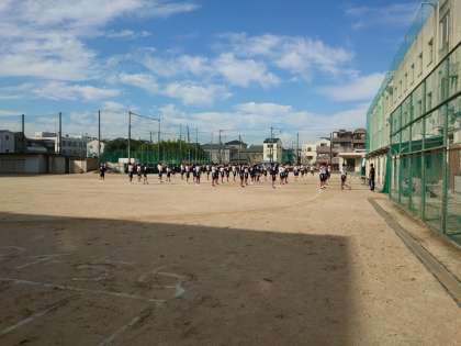 体育大会の学年練習の様子です。間隔をあけ、きびきびと行動します。
