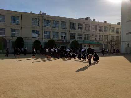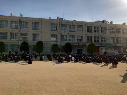 本日の土曜授業は、防災学習です。火災を想定した避難訓練の様子です。