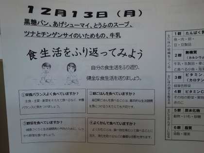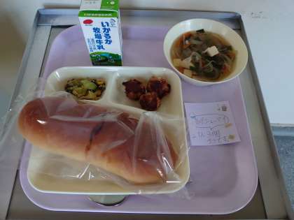 黒糖パン、あげシューマイ、とうふのスープ、ツナとチンゲンサイのいためもの、牛乳