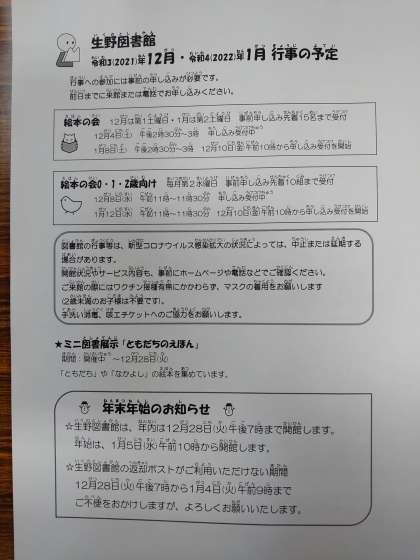 生野図書館 令和3(2021)年12月・令和4(2022)年1月 行事の予定