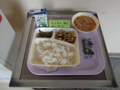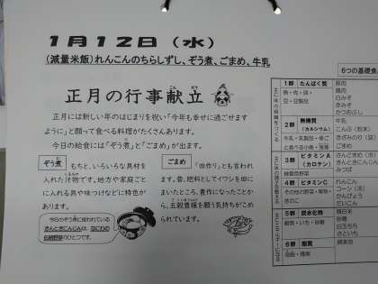 今日の給食には「ぞう煮」と「ごまめ」が出ます。