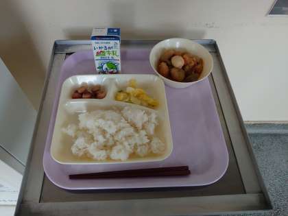 米飯、関東煮、はくさいの甘酢あえ、とら豆の煮もの、牛乳
