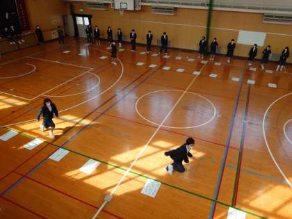 いつもと施行を変えて、「体育館に大きな札を広げて、周りの人が札のある位置を指示して、代表選手が走って取りに行く。」という頭と体を使った百人一首です。