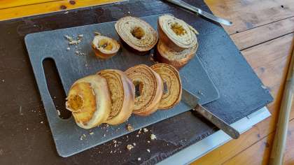 次はバームクーヘン作りです。少しこんがりと焼きあがりました。甘ーいにおいがたまらないです。美味しくいただきました。