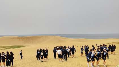 昼食の後、砂丘を少し散策しました。学級写真も撮りました。このあと制服に着替えるのとお土産を購入したら、大阪へと向かいます。