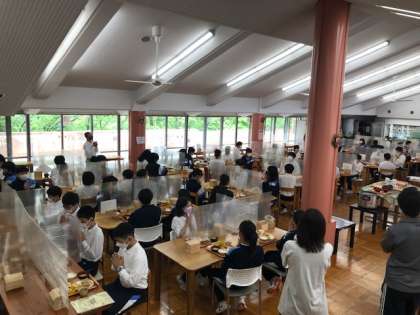 飛沫防止シートで感染対策をして、昼食の時間です。係の仕事もスムーズに進んでます。食事係の「いただきます!」でみんな元気に食事です。