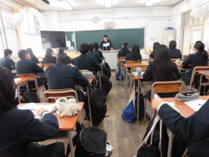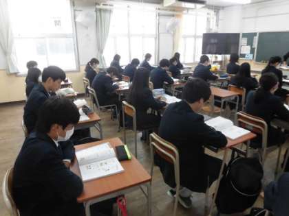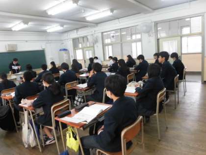 1年間の授業の進め方についての説明を聞いた後に、復習問題をしています。