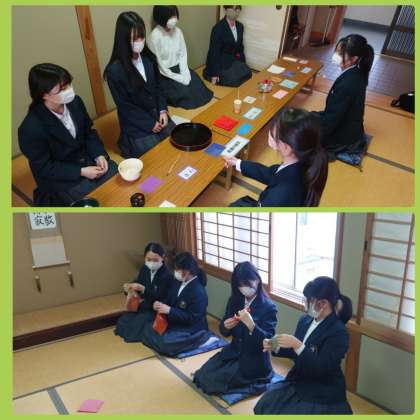 茶道で使う道具の紹介や、ふくさの畳み方を教わっています。