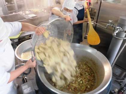 ・豚肉と野菜をいためた後、さっとゆでた中華めんを入れていためます。中華めんを入れると、とても重くなるので、調理員さんは力いっぱい焦げないように混ぜています。