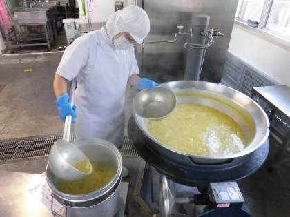 今日のスープには、粒のコーンとペーストのコーンをたっぷり使っています。野菜の甘みがとてもおいしいスープです。