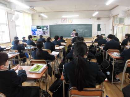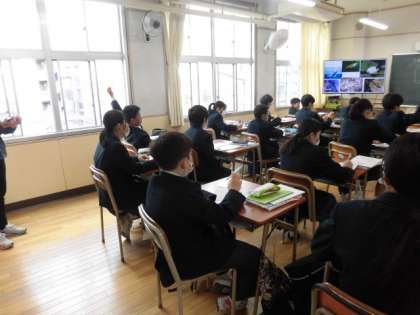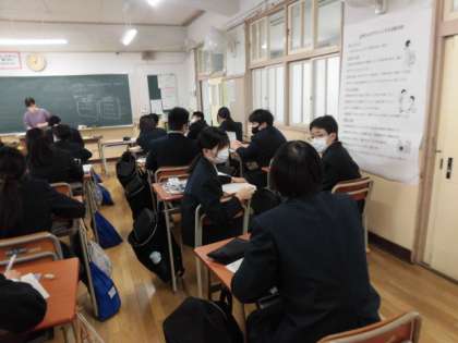 動物や植物をどのように分類するかについて考えています。近くの人と意見交換をしています。